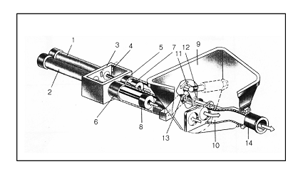 如圖圖所示泵送機(jī)構(gòu)由兩只主油缸(1、2),水箱3,換向裝置4,兩只混凝土缸(5、6),兩只混凝土活塞(7、8),料斗9,分配閥10(又稱S管)擺臂11,兩只擺動(dòng)油缸(12、13)和出料口14組成。